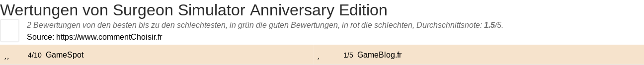 Hier sind alle 2 tests und Bewertungen zu Videospiele Surgeon Simulator Anniversary Edition mit den 2 Bewertungen und Kommentaren der Tester in ihrem Test.