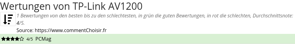 Hier sind alle 1 tests und Bewertungen zu Powerline-Adapter TP-Link AV1200 mit den 1 Bewertungen und Kommentaren der Tester in ihrem Test.