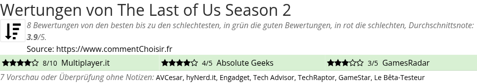 The Last of Us Season 2 im Test: 20 Reviews und 8 Bewertungen — Durchschnitt: 3.9/5