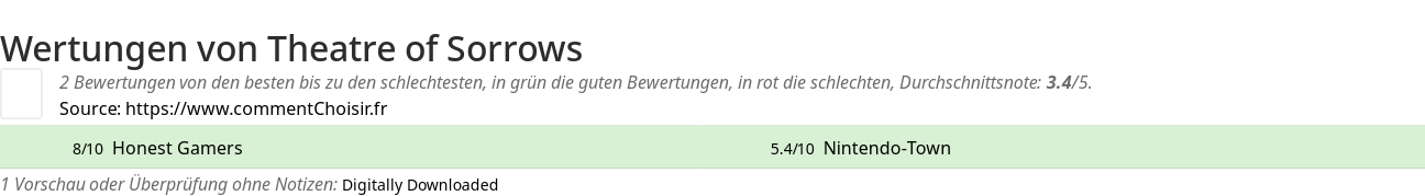 Hier sind alle 3 tests und Bewertungen zu Videospiele Theatre of Sorrows mit den 2 Bewertungen und Kommentaren der Tester in ihrem Test.