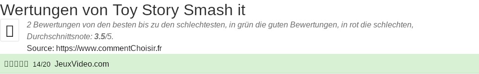 Hier sind alle 2 tests und Bewertungen zu Videospiele Toy Story Smash it mit den 2 Bewertungen und Kommentaren der Tester in ihrem Test.