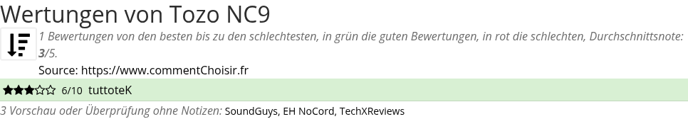 Tozo NC9 test : Wir haben nur eine Rezension zu diesem Produkt gefunden, daher klingt es schwierig, einen globalen Ratschlag zu geben. Diese durchschnittliche Bewertung von 3/5 ist möglicherweise nicht repräsentativ.
