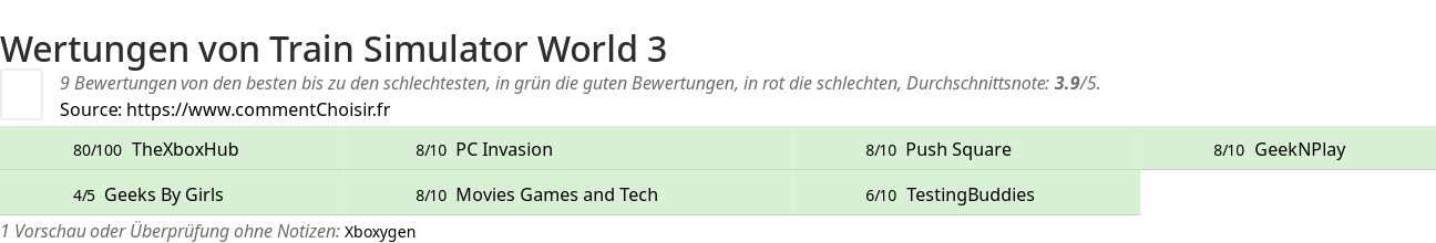 Hier sind alle 10 tests und Bewertungen zu Videospiele Train Simulator World 3 mit den 9 Bewertungen und Kommentaren der Tester in ihrem Test.