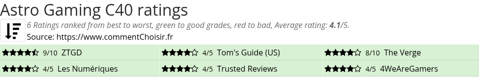 Theses reviews and tests from Game Accessories magazines and websites give 6 ratings, we get this average rating to this Astro Gaming product : 4.1/5.