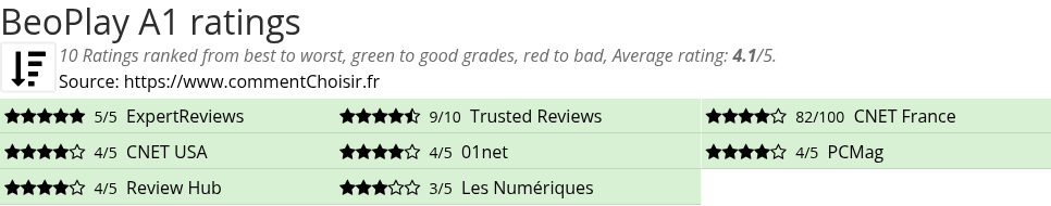 Theses reviews and tests from Speakers magazines and websites give 10 ratings, we get this average rating to this BeoPlay product : 4.1/5.