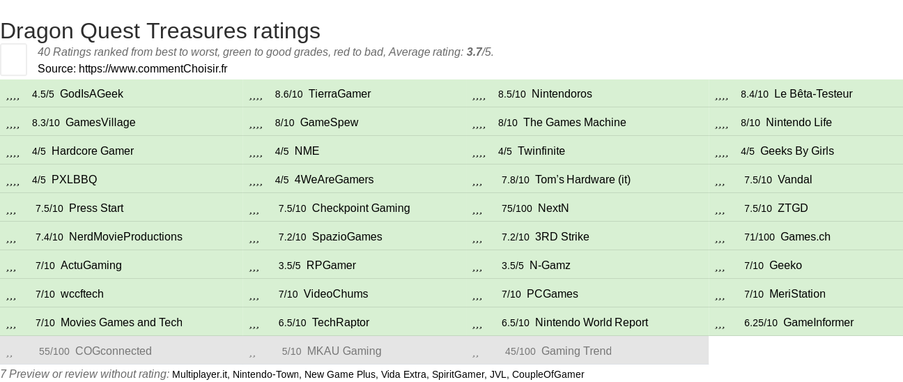 Theses reviews and tests from Video Games magazines and websites give 40 ratings, we get this average rating to this Dragon Quest product : 3.6/5.