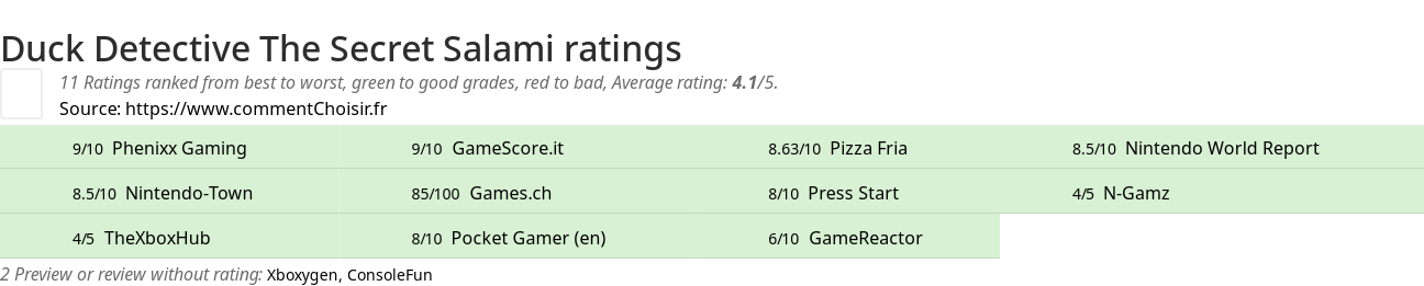 Theses reviews and tests from Video Games magazines and websites give 11 ratings, we get this average rating to this Duck Detective product : 4/5.