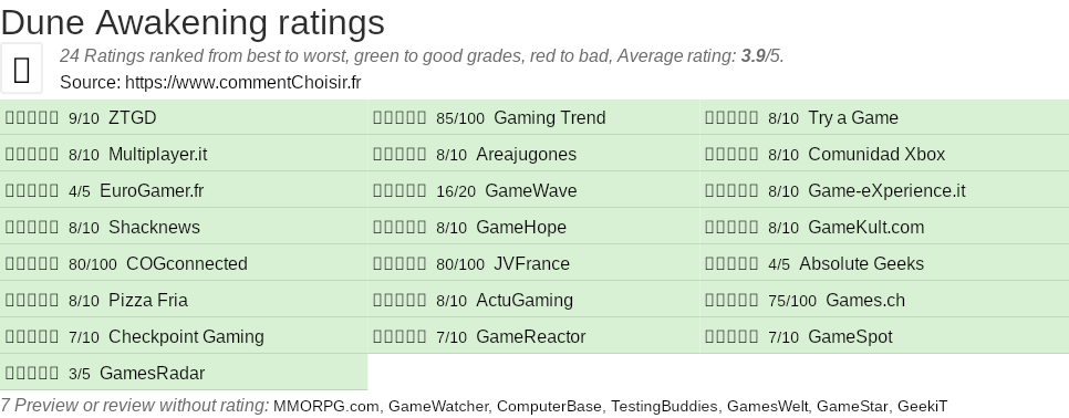 Theses reviews and tests from Video Games magazines and websites give 24 ratings, we get this average rating to this Dune product : 3.9/5.
