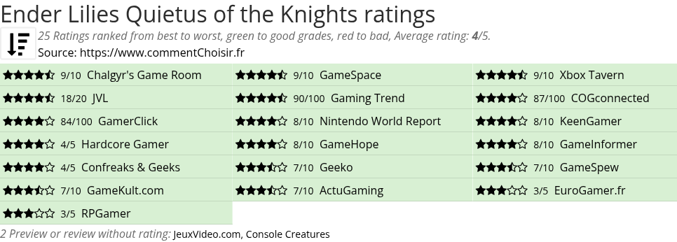 Theses reviews and tests from Video Games magazines and websites give 25 ratings, we get this average rating to this Ender Lilies product : 4/5.