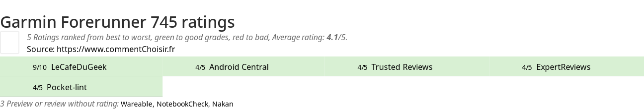 Theses reviews and tests from Smartwatches magazines and websites give 5 ratings, we get this average rating to this Garmin product : 4.1/5.