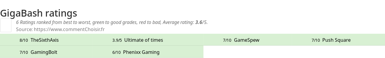Theses reviews and tests from Video Games magazines and websites give 6 ratings, we get this average rating to this GigaBash product : 3.4/5.