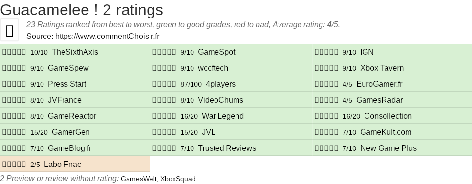 Theses reviews and tests from Video Games magazines and websites give 23 ratings, we get this average rating to this Guacamelee product : 4/5.