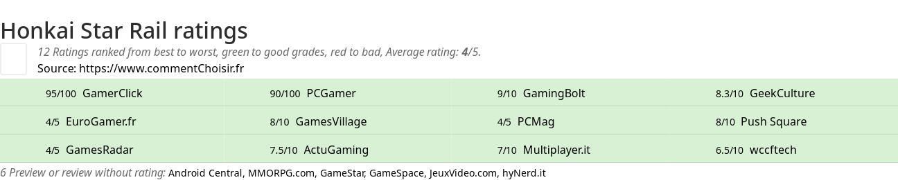 Theses reviews and tests from Video Games magazines and websites give 13 ratings, we get this average rating to this Honkai product : 4/5.