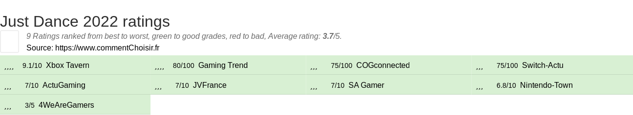 Theses reviews and tests from Video Games magazines and websites give 9 ratings, we get this average rating to this Just Dance product : 3.6/5.