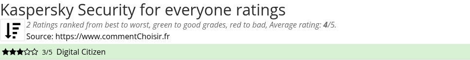 Theses reviews and tests from Softwares magazines and websites give 2 ratings, we get this average rating to this Kaspersky product : 4/5.