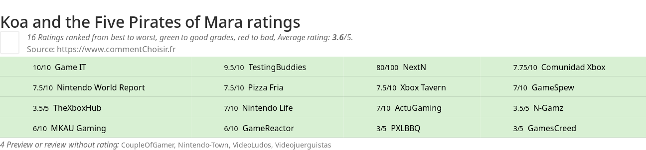 Theses reviews and tests from Video Games magazines and websites give 16 ratings, we get this average rating to this Koa and the Five Pirates of Mara product : 3.5/5.