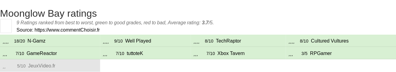 Theses reviews and tests from Video Games magazines and websites give 9 ratings, we get this average rating to this Moonglow Bay product : 3.7/5.