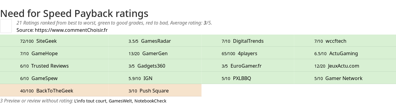 Theses reviews and tests from Video Games magazines and websites give 21 ratings, we get this average rating to this Need for Speed product : 3/5.