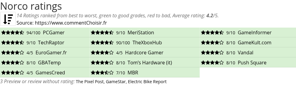 Theses reviews and tests from Video Games magazines and websites give 14 ratings, we get this average rating to this Norco product : 4.2/5.