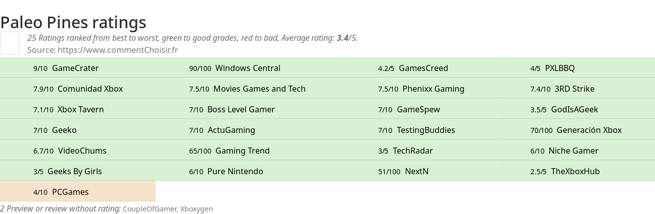 Theses reviews and tests from Video Games magazines and websites give 25 ratings, we get this average rating to this Paleo Pines product : 3.3/5.