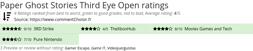 Theses reviews and tests from Video Games magazines and websites give 4 ratings, we get this average rating to this Paper Ghost Stories product : 4/5.