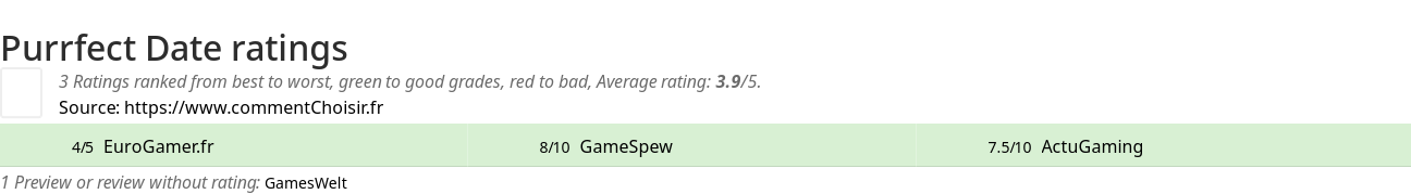 Theses reviews and tests from Video Games magazines and websites give 3 ratings, we get this average rating to this Purrfect Date product : 3.8/5.