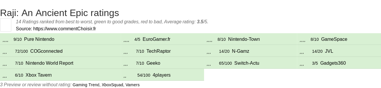 Theses reviews and tests from Video Games magazines and websites give 14 ratings, we get this average rating to this Raji: An Ancient Epic product : 3.5/5.