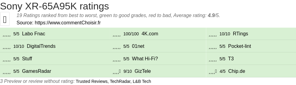 Theses reviews and tests from Televisions magazines and websites give 19 ratings, we get this average rating to this Sony product : 4.9/5.