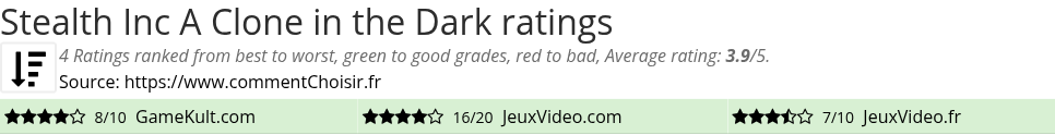 Theses reviews and tests from Video Games magazines and websites give 4 ratings, we get this average rating to this Stealth Inc product : 3.9/5.