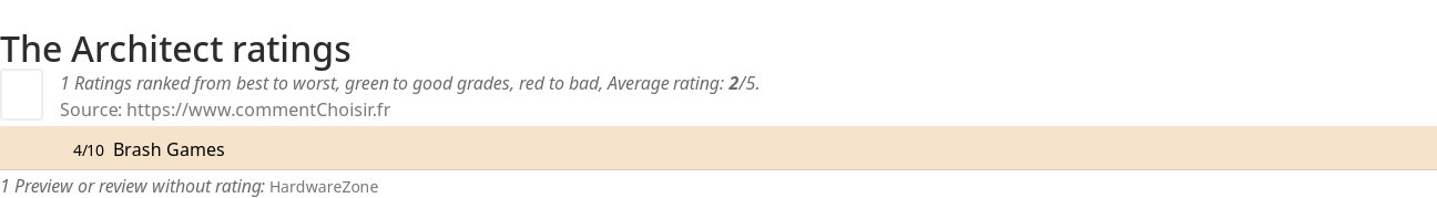 Theses reviews and tests from Video Games magazines and websites give 1 ratings, we get this average rating to this The Architect product : 2/5.