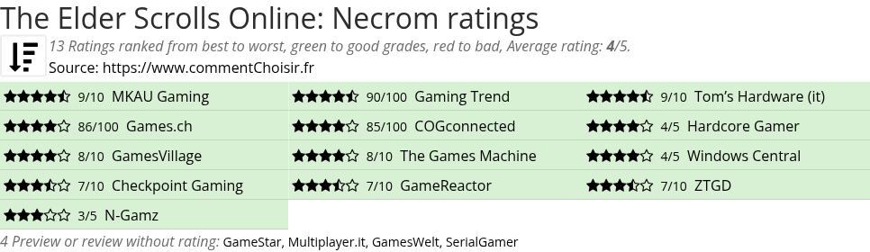 Theses reviews and tests from Video Games magazines and websites give 13 ratings, we get this average rating to this The Elder Scrolls product : 4/5.