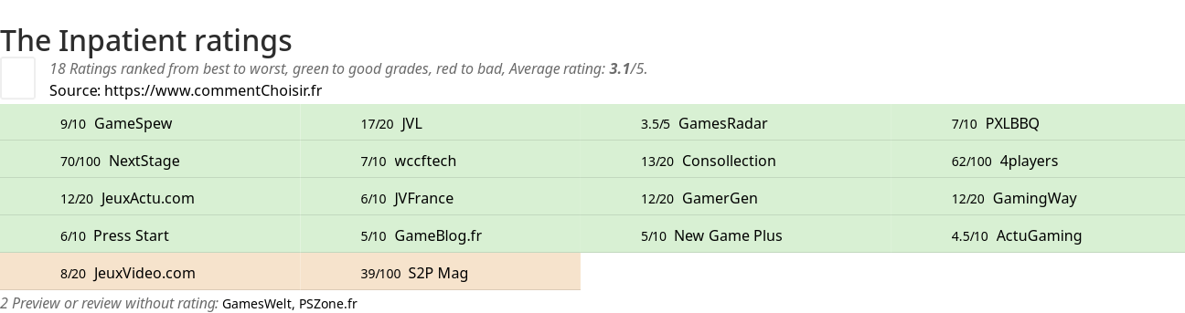 Theses reviews and tests from Video Games magazines and websites give 18 ratings, we get this average rating to this The Inpatient product : 3/5.