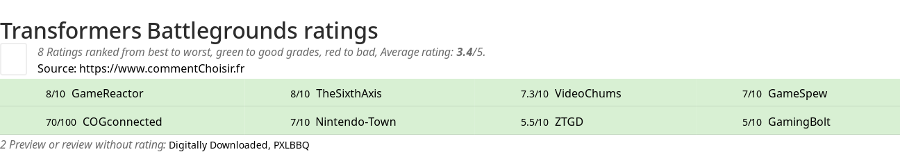 Theses reviews and tests from Video Games magazines and websites give 8 ratings, we get this average rating to this Transformers product : 3.4/5.
