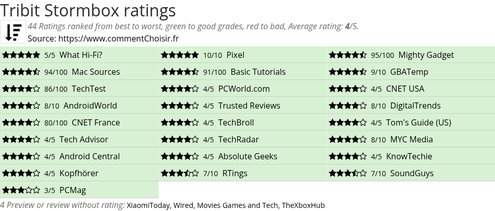 Theses reviews and tests from Gaming and Streaming magazines and websites give 45 ratings, we get this average rating to this Tribit product : 4/5.