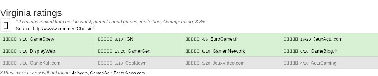 Theses reviews and tests from Video Games magazines and websites give 12 ratings, we get this average rating to this Virginia product : 3.3/5.