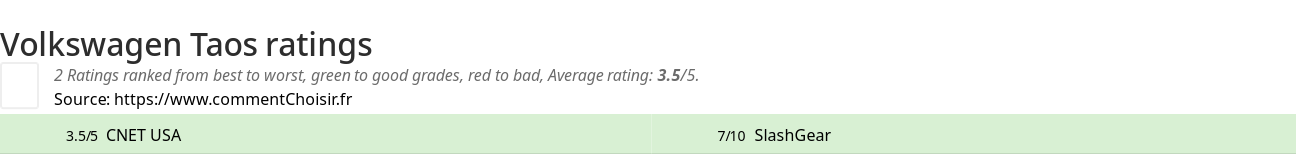 Theses reviews and tests from Cars magazines and websites give 2 ratings, we get this average rating to this Volkswagen product : 3.3/5.