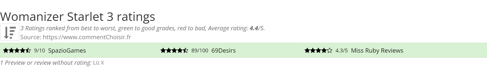 Theses reviews and tests from SexToy magazines and websites give 3 ratings, we get this average rating to this Womanizer product : 4.3/5.