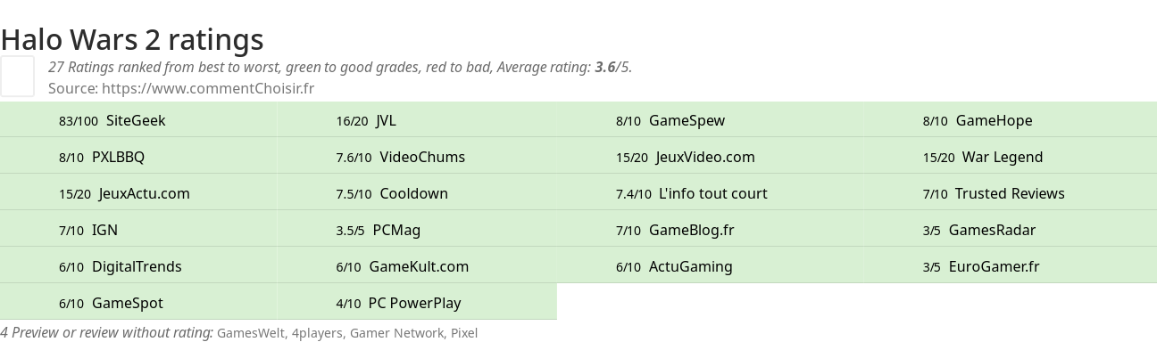 Theses reviews and tests from Video Games magazines and websites give 27 ratings, we get this average rating to this Halo product : 3.5/5.