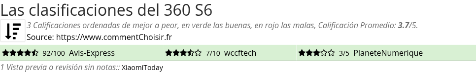 Las calificaciones de los sitios de Internet y las revistas pueden estar sesgadas, al menos con las reseñas de los clientes y los usuarios que compraron 360 S6 en Amazon o Fnac, estamos seguros de que tenemos reseñas reales sobre este producto. (los enlaces a las tiendas son patrocinados)