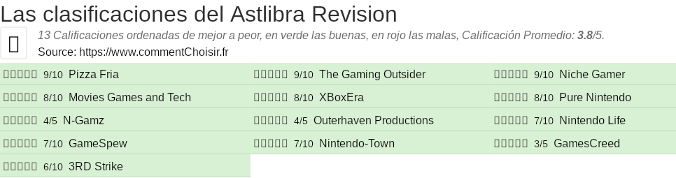 Entre estas pruebas de sitios de Internet y revistas especializadas en Videojuego, 13 dieron una calificación y obtenemos una calificación promedio de 3.8/5 para este producto Astlibra.