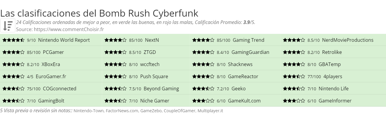 Las calificaciones de los sitios de Internet y las revistas pueden estar sesgadas, al menos con las reseñas de los clientes y los usuarios que compraron Bomb Rush Cyberfunk en Amazon o Fnac, estamos seguros de que tenemos reseñas reales sobre este producto. (los enlaces a las tiendas son patrocinados)