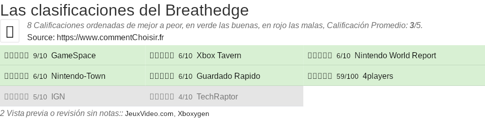 Entre estas pruebas de sitios de Internet y revistas especializadas en Videojuego, 8 dieron una calificación y obtenemos una calificación promedio de 3/5 para este producto Breathedge.