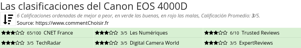 Las calificaciones de los sitios de Internet y las revistas pueden estar sesgadas, al menos con las reseñas de los clientes y los usuarios que compraron Canon EOS 4000D en Amazon o Fnac, estamos seguros de que tenemos reseñas reales sobre este producto. (los enlaces a las tiendas son patrocinados)