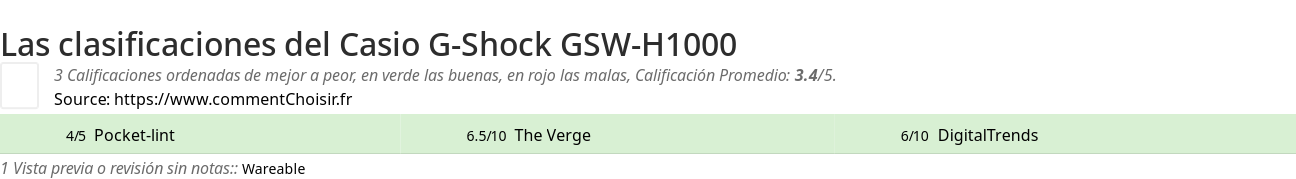Aquí están las 4 revisiones y pruebas encontradas en el Reloj inteligente Casio G-Shock GSW-H1000 con las 3 calificaciones y comentarios de los evaluadores en su revisión.