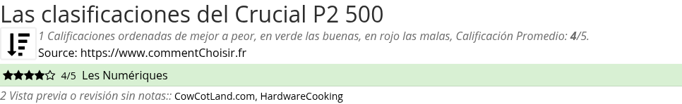Entre estas pruebas de sitios de Internet y revistas especializadas en Disco duro, 1 dieron una calificación y obtenemos una calificación promedio de 4/5 para este producto Crucial.