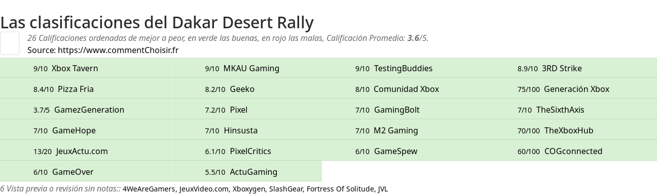 Entre estas pruebas de sitios de Internet y revistas especializadas en Videojuego, 26 dieron una calificación y obtenemos una calificación promedio de 3.6/5 para este producto Dakar.