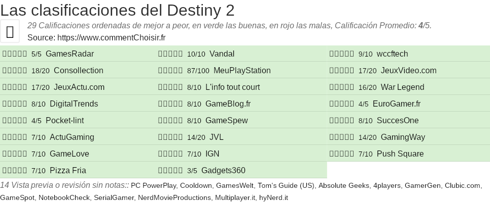 Entre estas pruebas de sitios de Internet y revistas especializadas en Videojuego, 29 dieron una calificación y obtenemos una calificación promedio de 4/5 para este producto Destiny.
