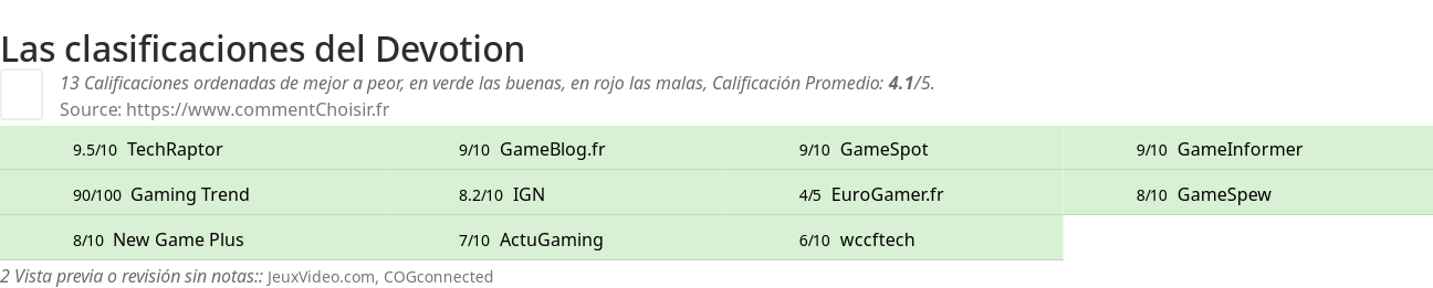 Entre estas pruebas de sitios de Internet y revistas especializadas en Videojuego, 13 dieron una calificación y obtenemos una calificación promedio de 4.1/5 para este producto Devotion.
