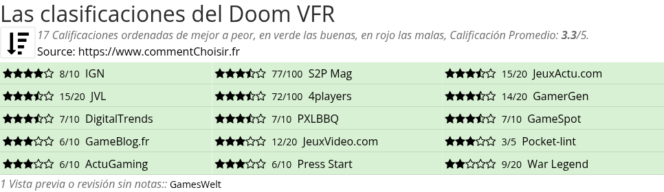 Entre estas pruebas de sitios de Internet y revistas especializadas en Videojuego, 17 dieron una calificación y obtenemos una calificación promedio de 3.3/5 para este producto Doom.