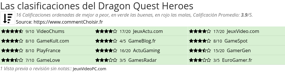 Las calificaciones de los sitios de Internet y las revistas pueden estar sesgadas, al menos con las reseñas de los clientes y los usuarios que compraron Dragon Quest Heroes en Amazon o Fnac, estamos seguros de que tenemos reseñas reales sobre este producto. (los enlaces a las tiendas son patrocinados)